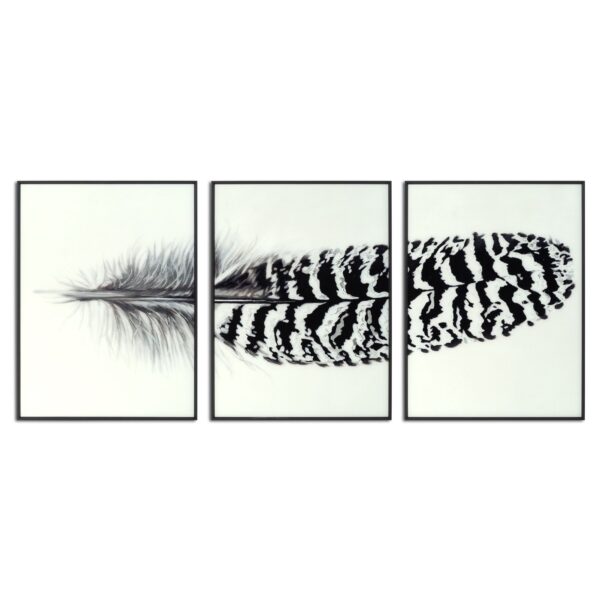 This is the Black Striped Feather Over 3 Black Glass Frames. A stunning multi frame piece of artwork in striking monochrome tones. This contemporary piece is set off by its black frame and subtle metallic flecks to the feather’s design which will catch the light and add a striking focal point to any room. Use the picture loops on the reverse of this piece to hang it horizontally or vertically, according to your space.