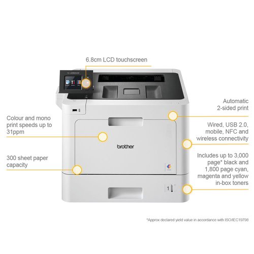 Ideal for use in a small office environment, the Brother HL-L8360CDW colour laser printer offers a print speed of up to 31 pages per minute and a print resolution of up to 2400 x 600dpi. With connectivity via Wi-Fi, USB and ethernet, it also benefits from advanced mobile connectivity via iPrint&Scan, Airprint, Android Print Service Plugin, Cortado Cloud Print, Google Cloud Print 2.0, Mopria, NFC, and Wi-Fi Direct. An intuitive 6.8cm LCD colour touchscreen, automatic 2-sided printing, a 300 sheet input tray and powerful security features, including a function lock, make the HL-L8360CDW a great choice.