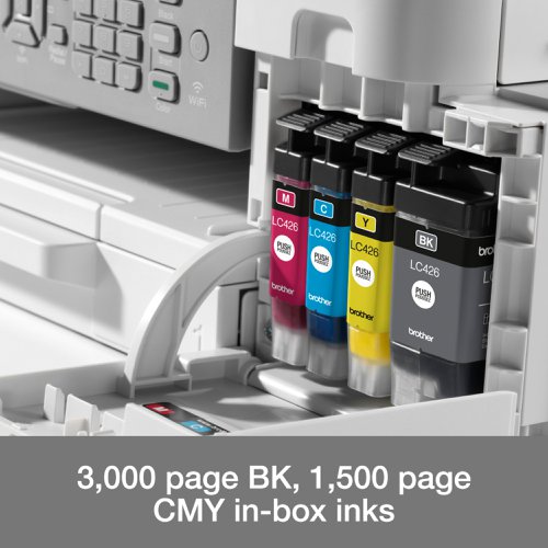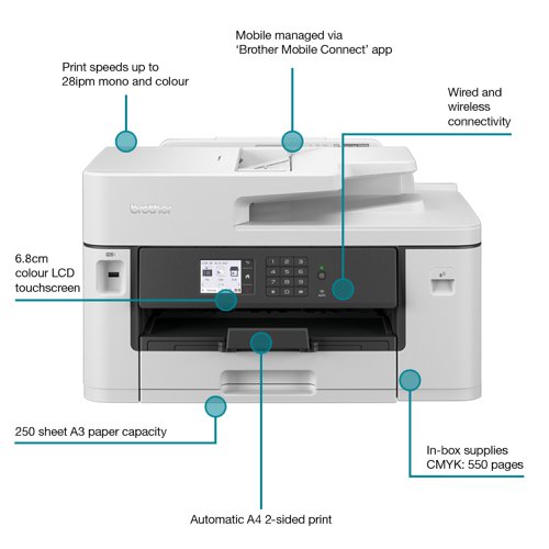 The Brother A3 MFC-J5340DW All-in-One inkjet printer has wireless and wired connectivity, ideal for the small office and business workgroups. With mobile connectivity via Brother Mobile Connect app, Apple Airprint, Brother Print Service Plugin, Mopria. Easy to navigate through the functionality via the 68mm colour touchscreen LCD control panel. Supplied with LC422 cartridges (CMYK) (550 pages per cartridge).